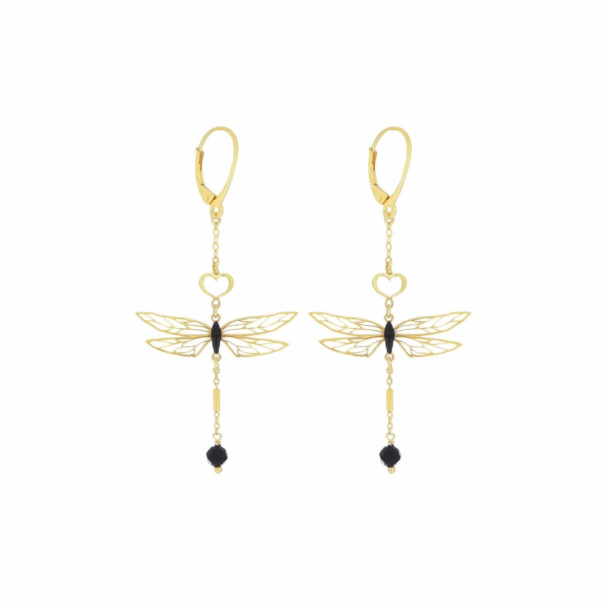 Coppia di orecchini a monachella realizzato in argento 925 con galvanica oro giallo ad alto spessore e resistenza. L'orecchino presenta cuore maman e una libellula in lastra bidimensionale finitura lucida e corpo smaltato in nero di dimensioni 3 cm con sfera di spinello sfaccettata di 4mm all'estremità della coda. La lunghezza totale dell'orecchino, compresa la monachella, è di 6 cm.