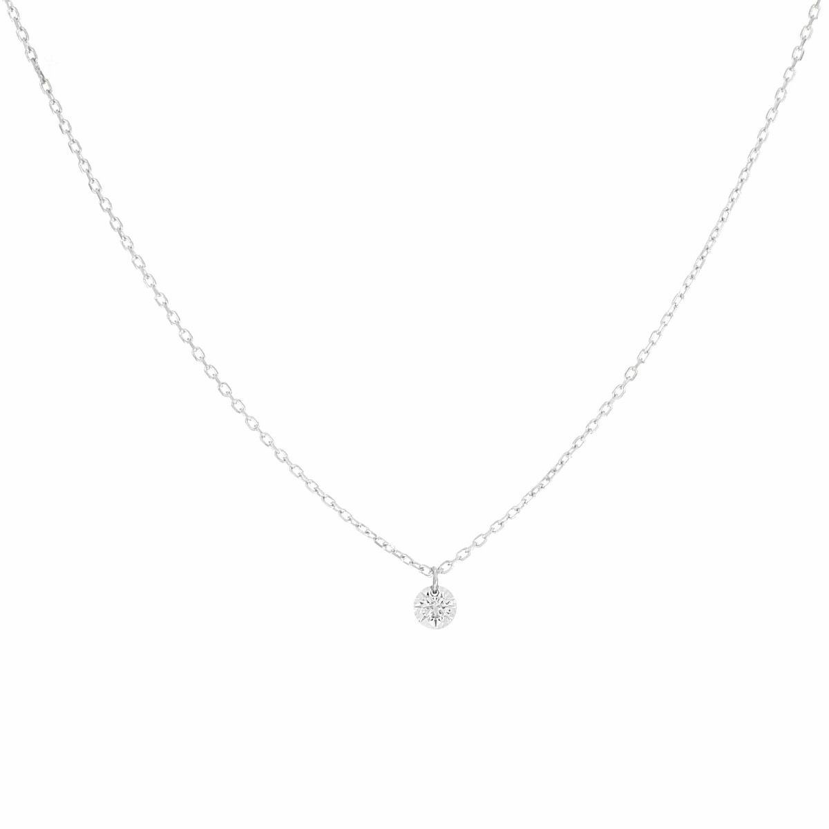 Il girocollo presenta un diamante taglio brillante pendente di 0,07 carati sospeso nel vuoto.