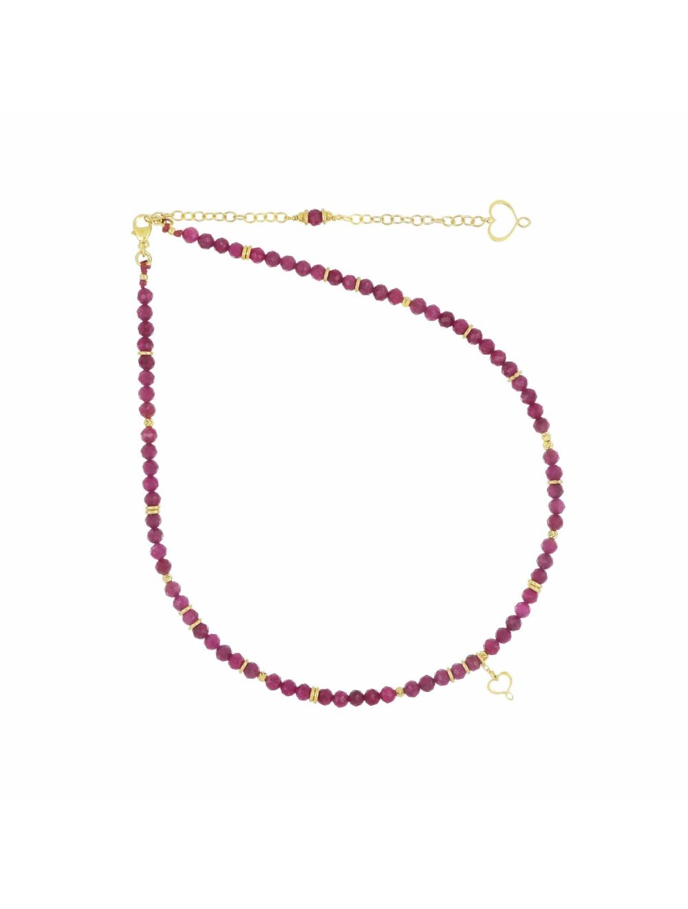 Girocollo in argento 925 con galvanica oro giallo ad alto spessore e ad alta resistenza. Il girocollo è ricoperto per tutta la sua superficie da pietre di rubino sfaccettato alternate ad elementi decorativi in argento. Presenta al centro mini cuore maman pendente.